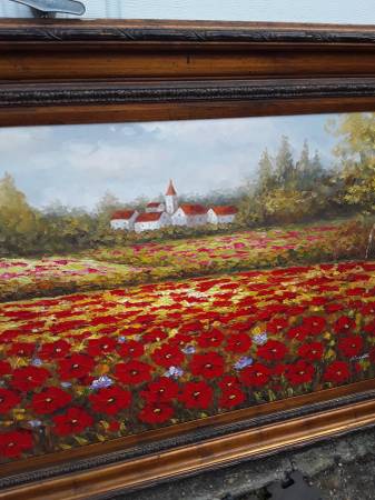 This is a large painting. In very excellent condition. It has a church, and trees,surrounded by a flower field.