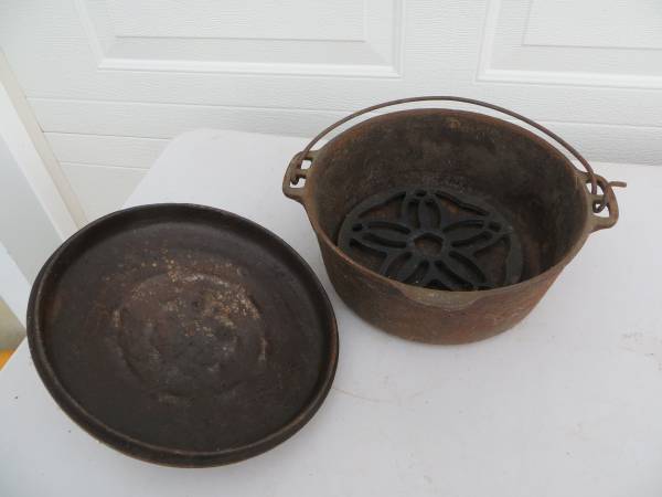 NICE OLD CAST IRON DUTCH OVEN WITH HAMMERED LID. 5 QUART, MADE IN THE USA. $30.00 CONTACT JOE AT