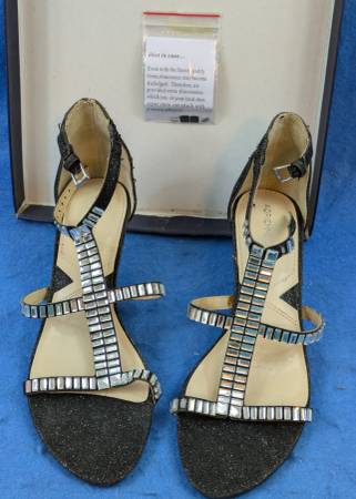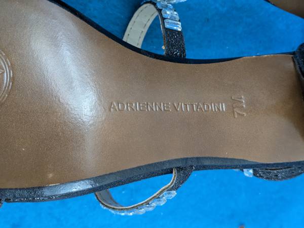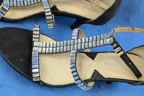 Adrienne Vittadini "Kala" Black Bling Ankle Strap Kitten Heel Sandals Size 7 Look great on the boardwalk Open toe sandals accented with rhinestones and have a kitten heel These shoes are perfect for...