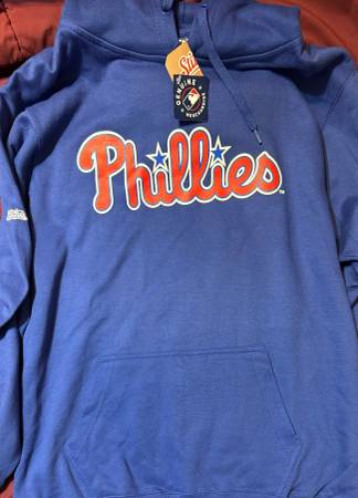 Philadelphia Phillies hoodie hooded sweatshirt sweat shirt with hood sweater. blue with red and white PHILLIES print. Brand new.