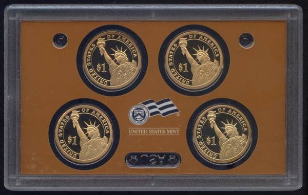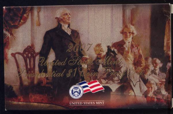 The product is a 2007-S US Mint Presidential Dollar Proof Set, which includes four uncirculated coins featuring George Washington, John Adams, Thomas Jefferson, and James Madison. This is the first year in the Presidential Commemorative program. The set comes in its original government packaging (OGP) box and includes a Certificate of Authenticity (COA). The coins are made of an alloy and were struck at the San Francisco Mint. They are certified by the U.S. Mint.