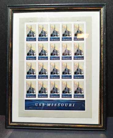 Downsizing and selling a framed, USPS Issued sheet of twenty "FOREVER" stamps commemorating the historic Battleship U.S.S. MISSOURI (SCOTT 5392 MNH). Since these are Forever stamps they are guaranteed to appreciate each time the USPS raises the price of Forever stamps, currently priced at $.78 each. Stored in a clear plastic sleeve since purchased in 2000.
