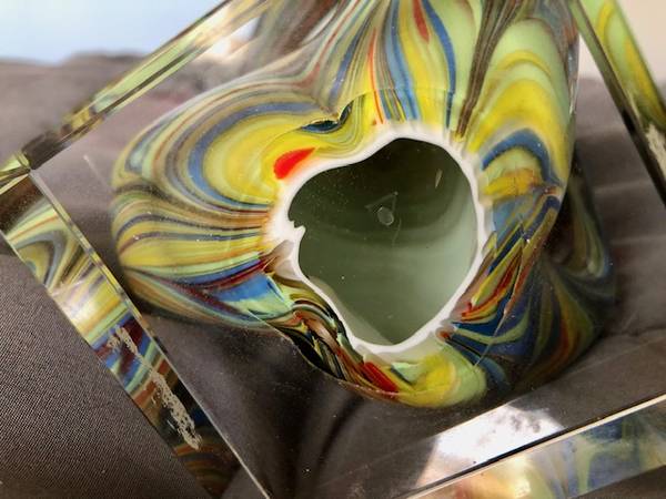 Vintage decorative, gorgeous Murano freeform art glass sculpture. Beautiful striations in several complementary colors cased in clear gently curving spiraling limbs. A dazzling example of Italian glass artistry, this vintage Murano sculpture captures the timeless elegance and technical brilliance of hand-blown Venetian glass. Mounted on a thick square pedestal, approximately 13 inches tall and weighing in at a hefty 4 pounds, this piece will add an air of elegance to any room. Excellent condition. No chips or flaws.