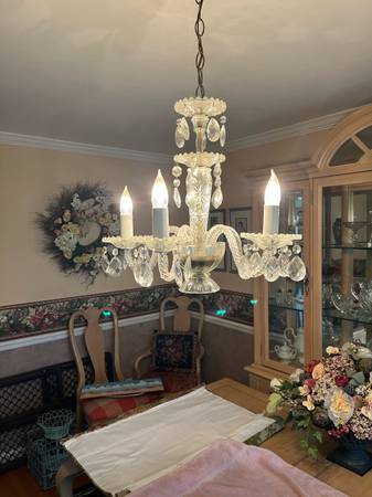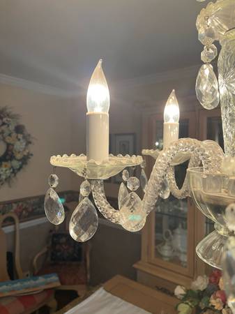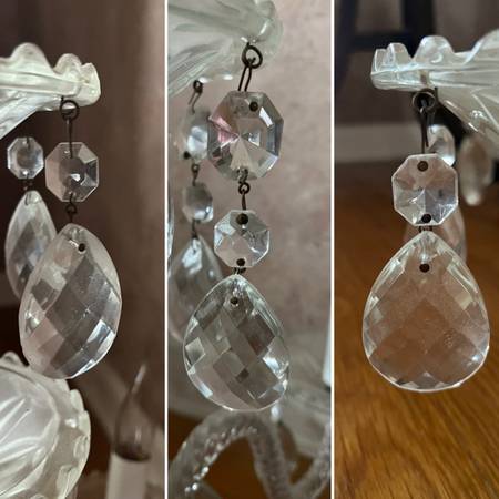 Mid-century crystal chandelier, 5 arms with candle lights, 35 total hanging pendants with crystals Dimensions are 19” wide by 18” tall with hanging height of 32” See photos for details.