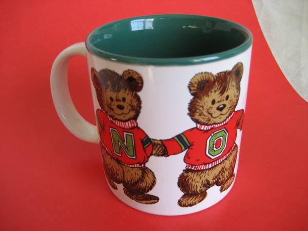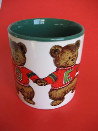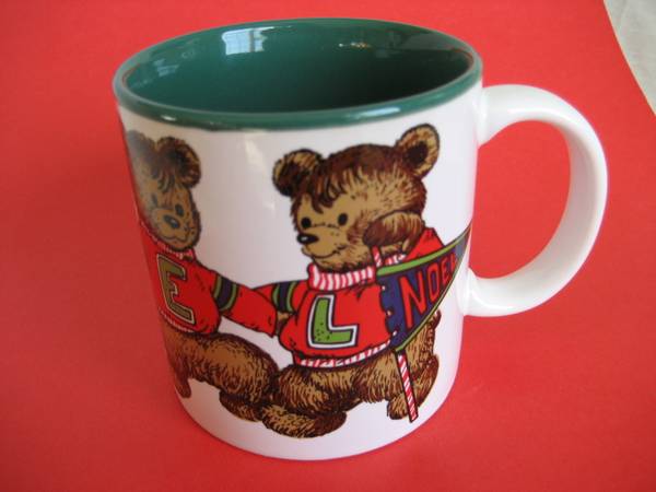 Vintage Potpourri Press Christmas Cup --no utensils marks, no chips or cracks. Looks NEW Approx. 3.5" high x 3.25" diameter plus handle 4 Bears in red sweaters with green letters spelling NOEL Noel...