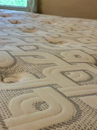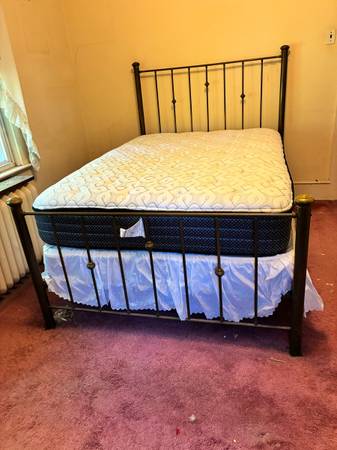 CONTACT BY EMAIL TEXT OR CRAIGLIST CHAT • Vintage sturdy brass bed frame • Headboard and footboard with elegant vertical bars and brass accents • Includes a comfortable mattress with a quilted top...