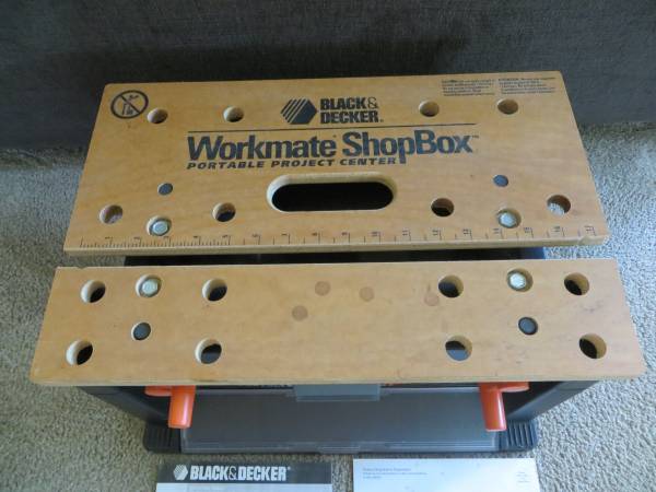 BLACK & DECKER WORKMATE PORTABLE SHOP BOX WITH ADJUSTABLE VISE TABLETOP. INCLUDES THE INSIDE TRAY AND FOUR PEGS. GREAT CONDITION AS SEEN. $50.00 CONTACT JOE AT