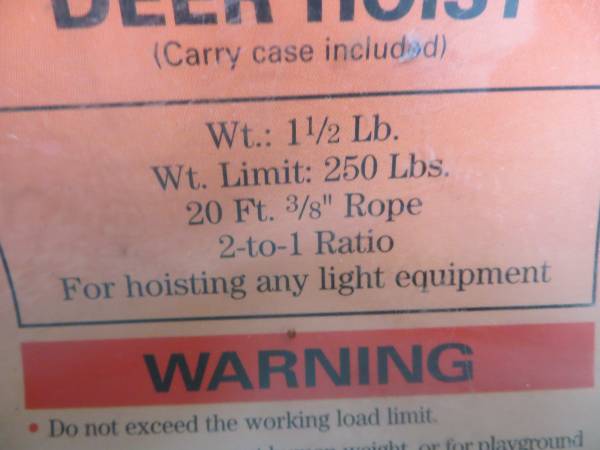 NEW DEER HOIST. WEIGHT LIMIT IS 250 POUNDS. 20 FOOT 3/8" ROPE. 2-TO-1 RATIO. FOR HOISTING ANY LIGHT EQUIPMENT. $10.00 CONTACT JOE AT