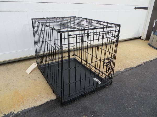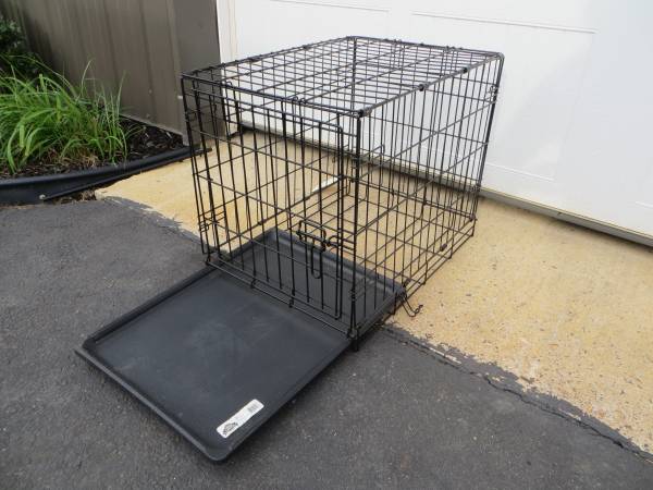 NICE SMALLER SIZE DOG CRATE / PET CAGE. 24" x 17" x 19" TALL. HAS ONE LARGE DOOR AND NICE BOTTOM PLASTIC PULL-OUT TRAY. FOLDS FOR EASY TRANSPORT/STORAGE. $20.00 CONTACT JOE AT