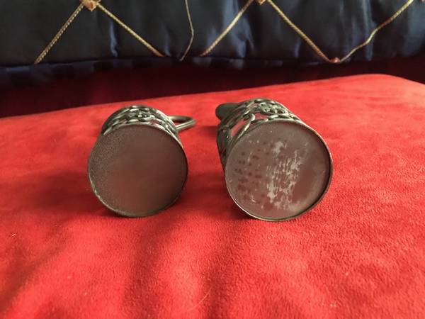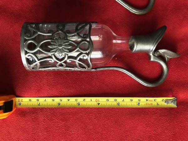 This vintage pewter glass oil and vinegar bottle set is a classic addition to any kitchen or dining room. The set includes two bottles, each standing at 7 inches tall, with beautiful floral filigree detail. These bottles are perfect for adding a touch of elegance to any meal and are great for those who love to cook and entertain.