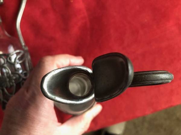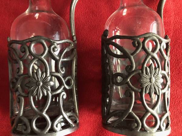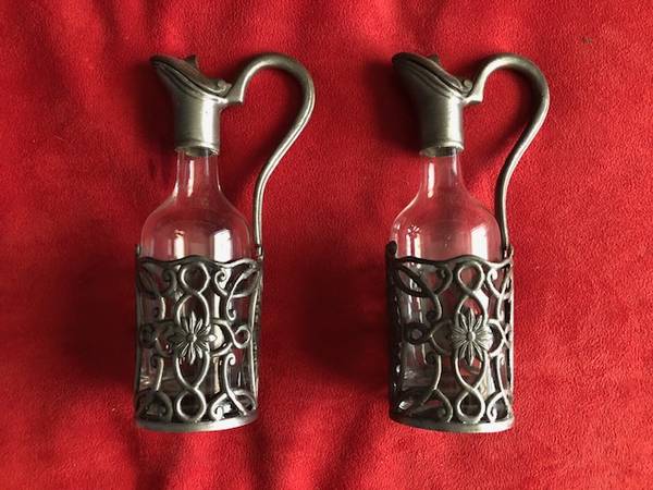 Whether you're a collector or simply looking for a charming addition to your home, these vintage pewter glass oil and vinegar bottles are a must-have.