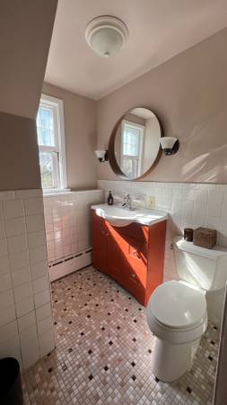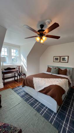 The furnished bedroom (~450 Square Feet) is located on the 3rd floor and comes with a private bathroom located immediately outside the bedroom on that same floor. The bedroom is furnished with a queen bed/frame/linens, two sitting chairs, a 3-drawer dresser, small desk & chair, and closet. Overhead light & fan, personal window AC in the warmer months. Bathroom is tiled and has a wide vanity with storage, toilet, standing shower.