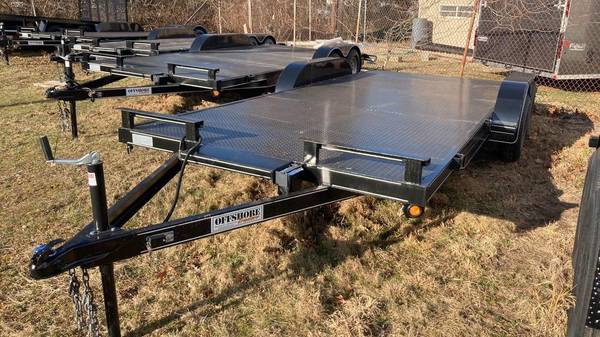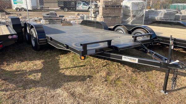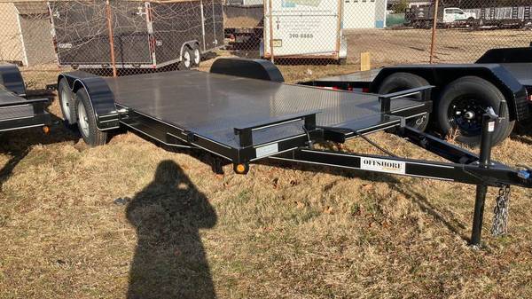 Brand new 16’ steel deck car hauler Tandem axle Electric brakes 2” coupler Rear ramps stored under trailer 7k gvwr 5k capacity Winch mount standard 7pin wire harness 82” between fenders Ready to work